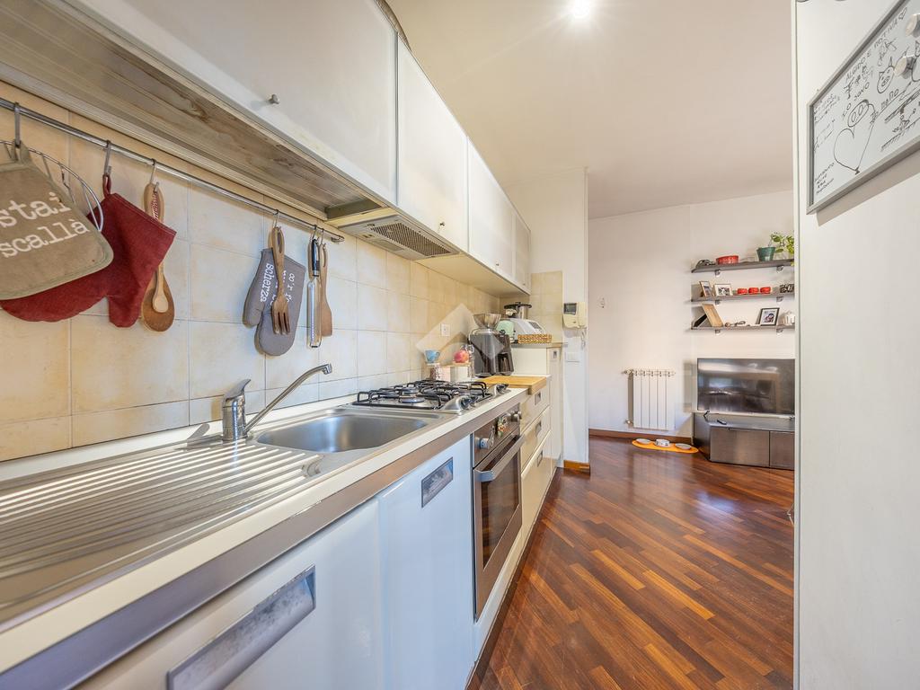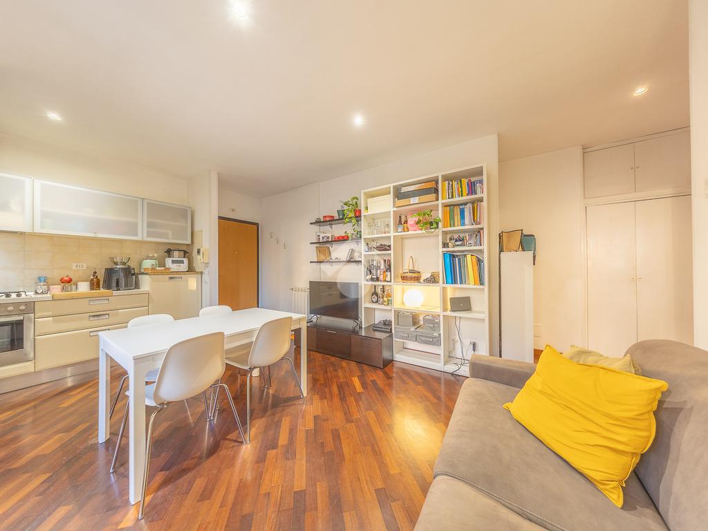 L’appartamento si compone di un accogliente soggiorno con angolo cottura, dal quale si accede al balcone abitabile. La zona notte è composta da una spaziosa camera matrimoniale dotata di cabina armadio e da un servizio con box doccia.